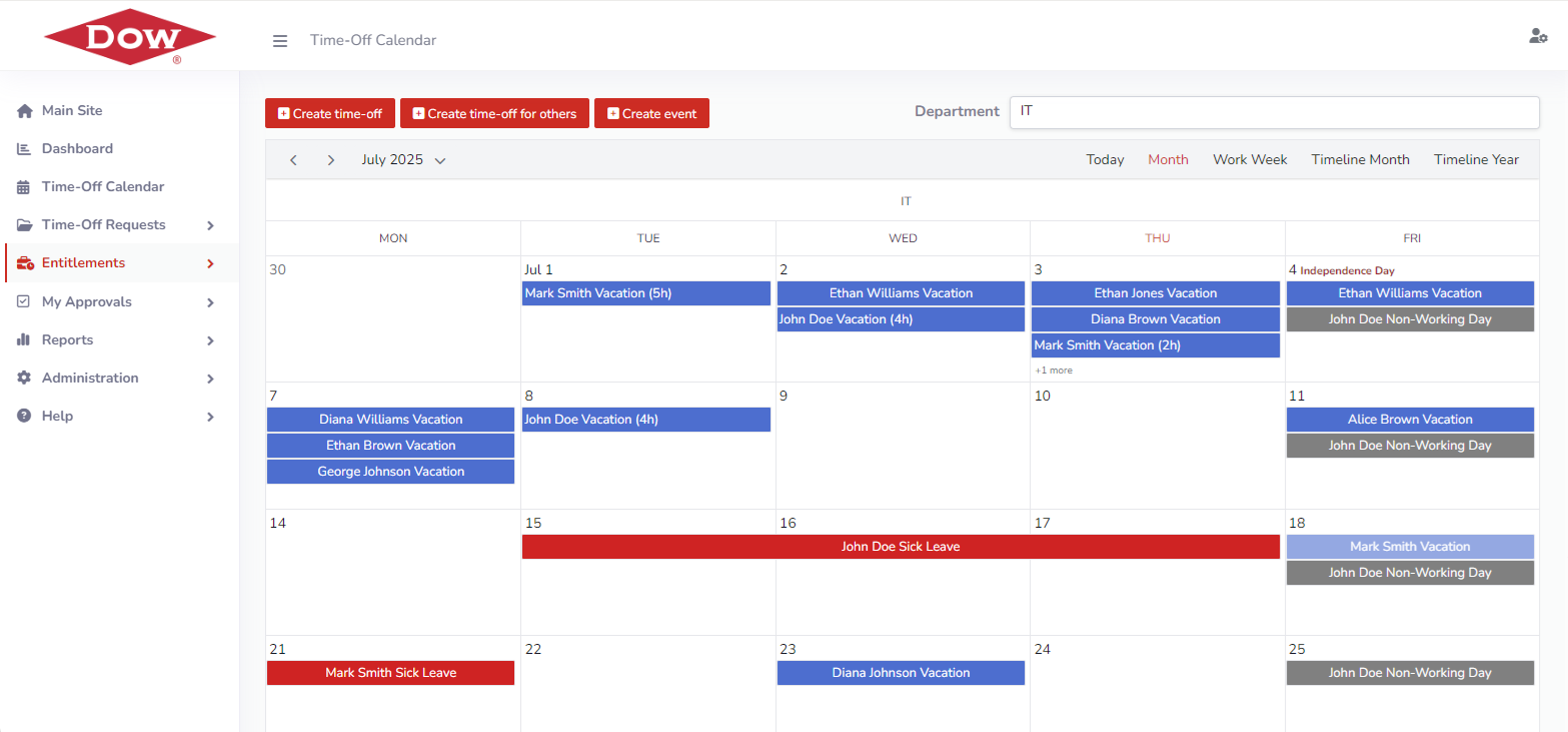 It supports monthly, weekly, and yearly views, along with a department filter for easier navigation.