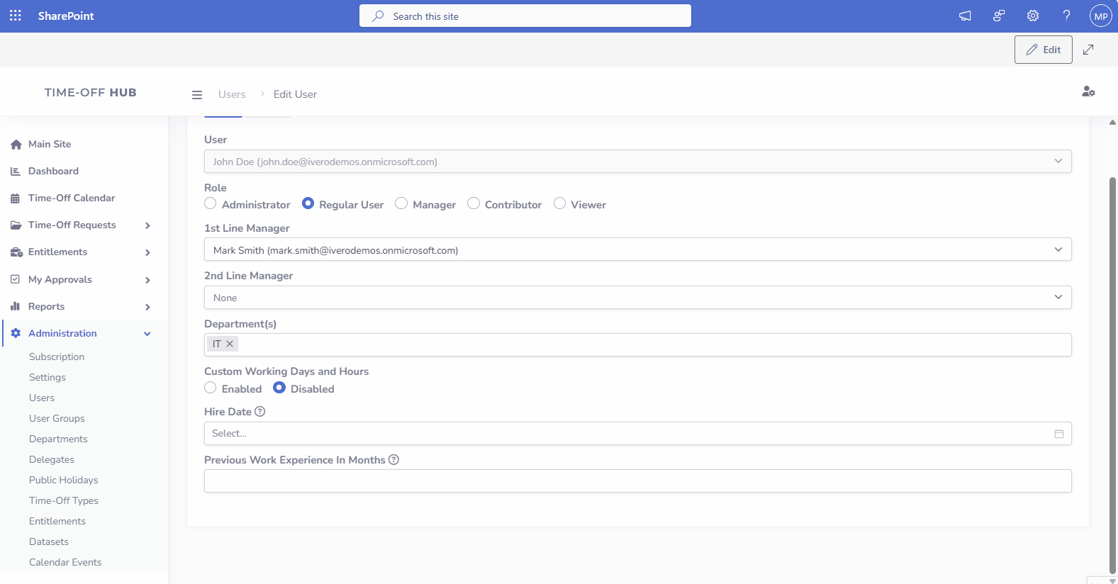 App administrators can set custom working days and hours to accommodate part-time employees, ensuring accurate time-off calculations and scheduling.