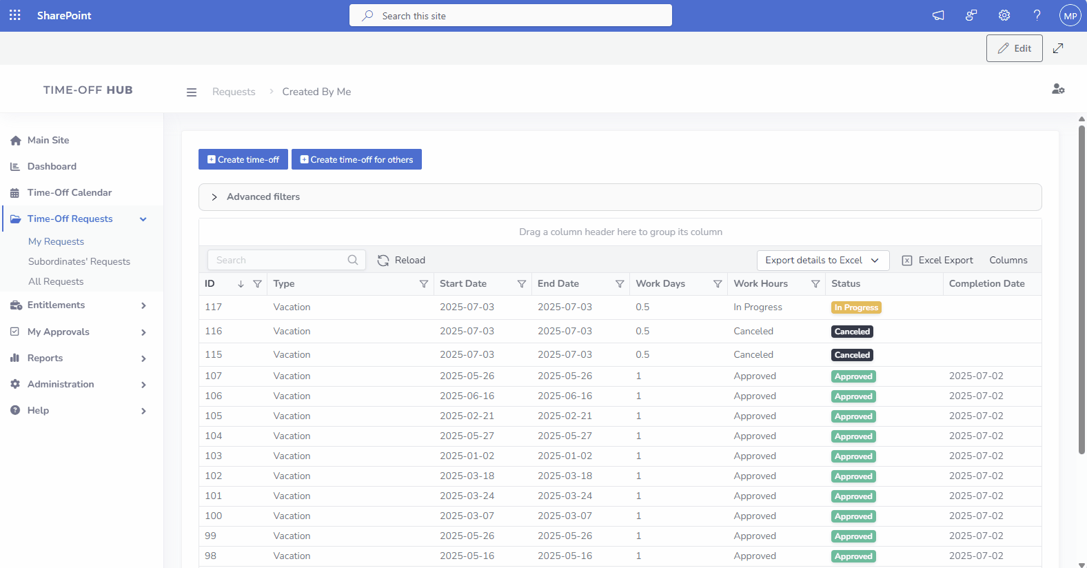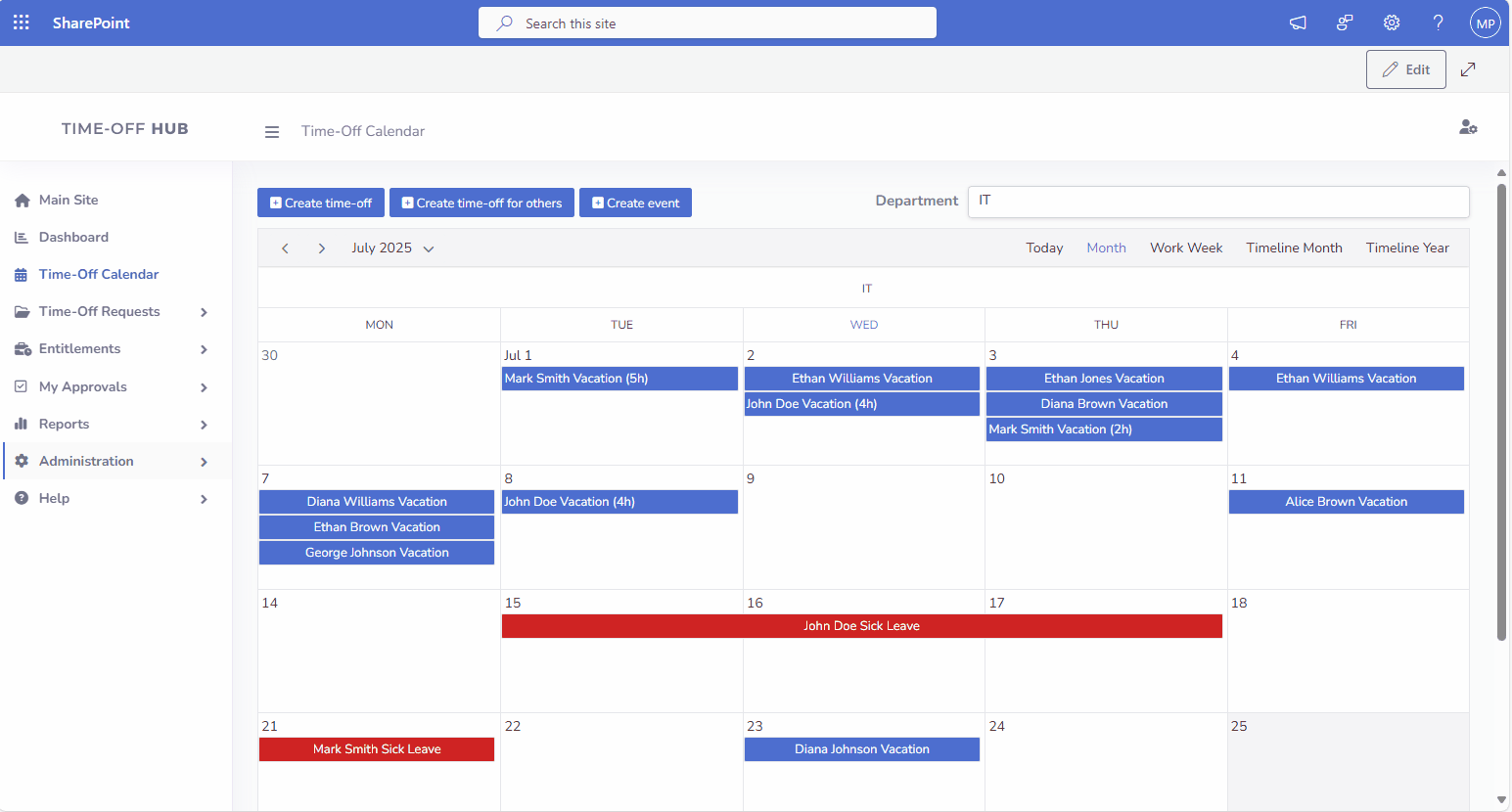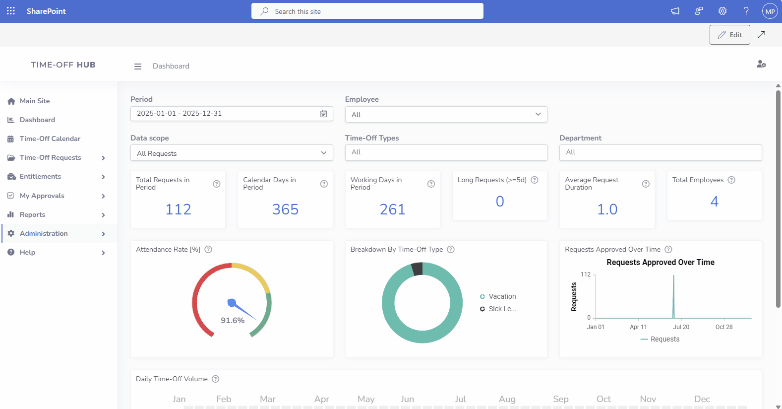 Time-Off Hub includes an "Integrations" feature that exports data to the native SharePoint calendar list. By using this list, you can fully leverage Microsoft 365’s Power Platform—connect with external systems through Power Automate and gain deeper insights with Power BI’s advanced data visualization and analysis tools.