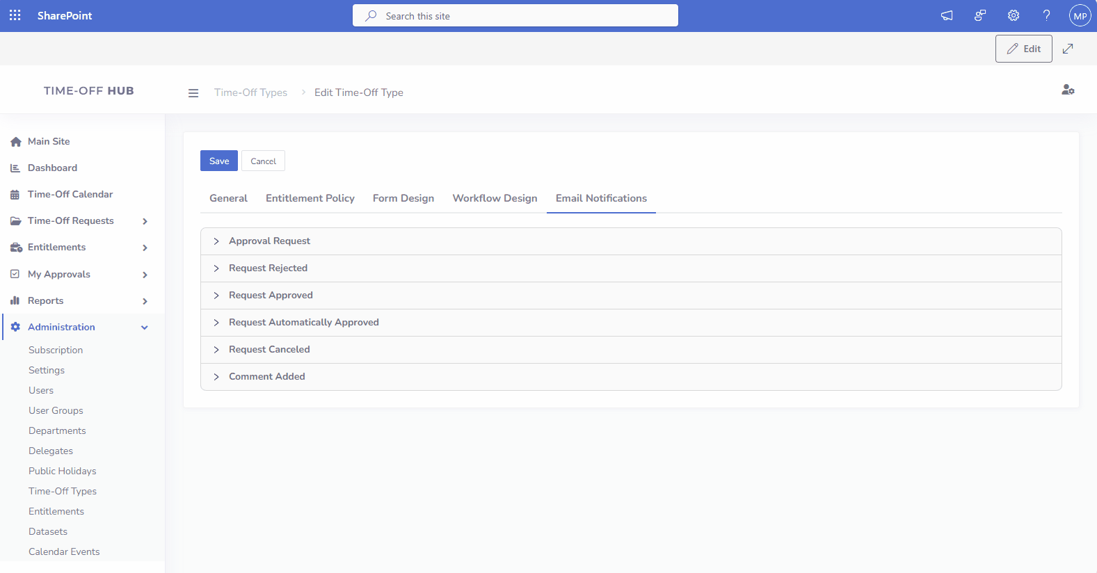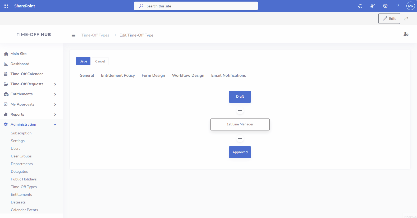 App administrators can create and manage custom time-off types that align with company policies—whether it’s vacation, sick leave, PTO, training, or a unique category. Each type can have its own entitlement rules, request form with custom fields, and a tailored approval and notification workflow. You can also configure visibility, limits, and permissions to suit specific employees or groups.