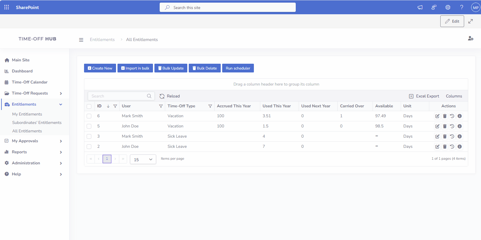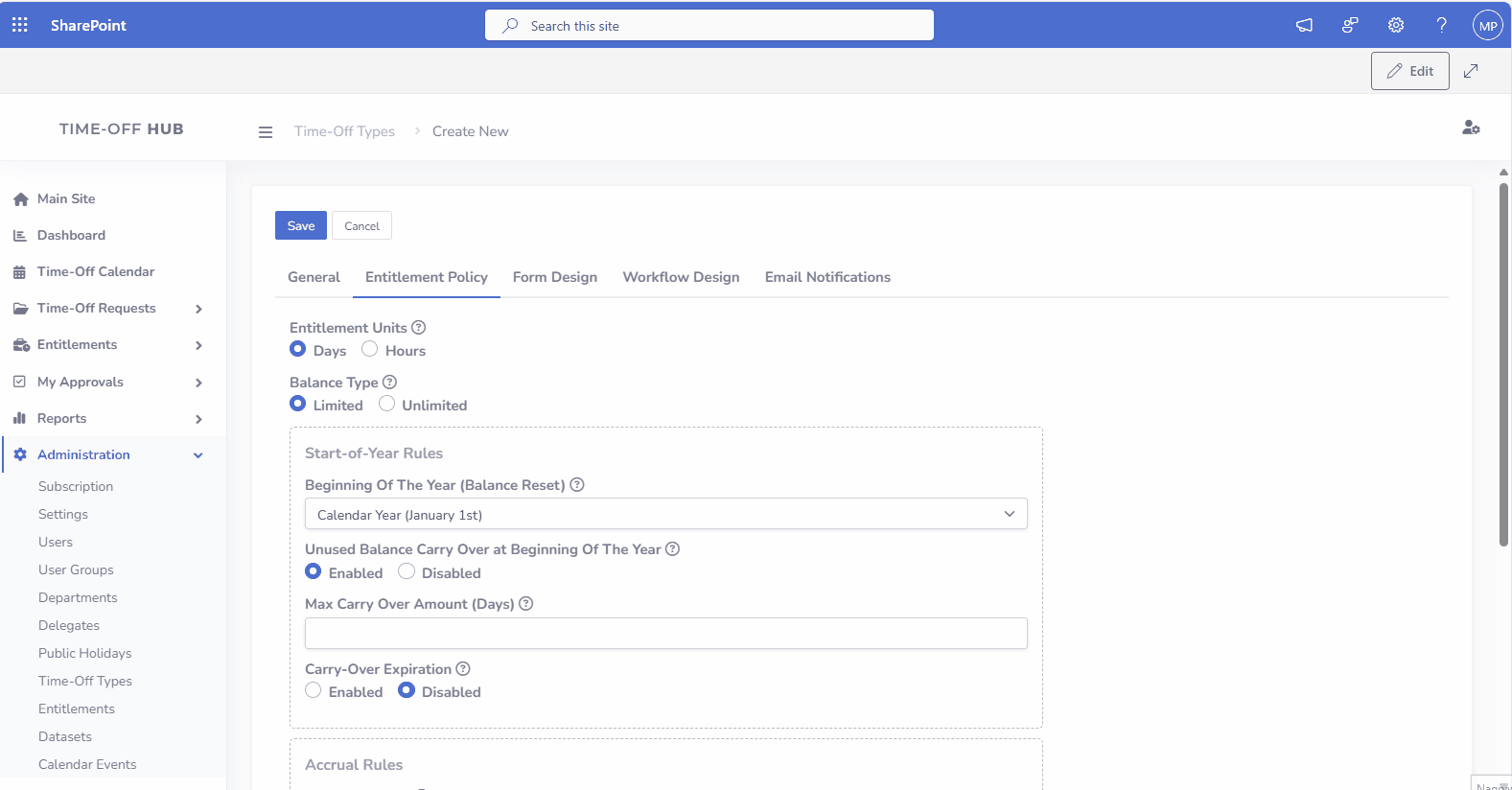 App administrators can define time-off entitlements for each leave type (e.g., Vacation, Sick Leave), each with its own auto-accrual policy.