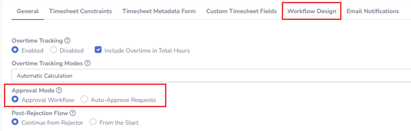 | Approval Mode | Select how timesheets should be processed. Choose Approval Workflow to require approvals through the configured path (tab "Workflow Design"), or Auto-Approve Request to automatically approve all timesheet requests without any approval steps. |
