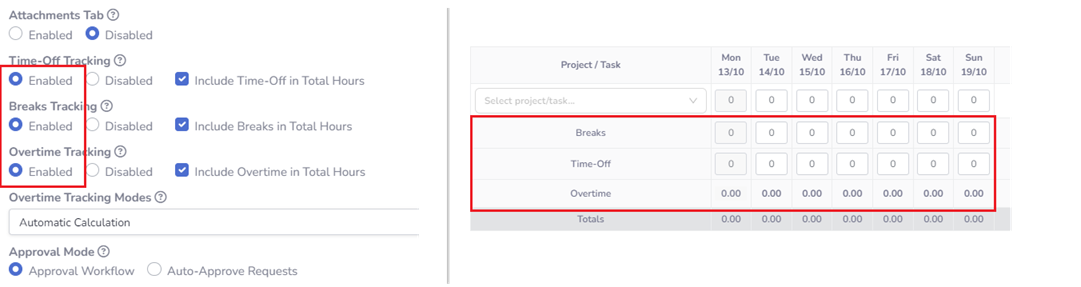 | Time-Off Tracking | Enable this option to include time-off entries in timesheets. When disabled, time-off data will not be tracked or displayed. |