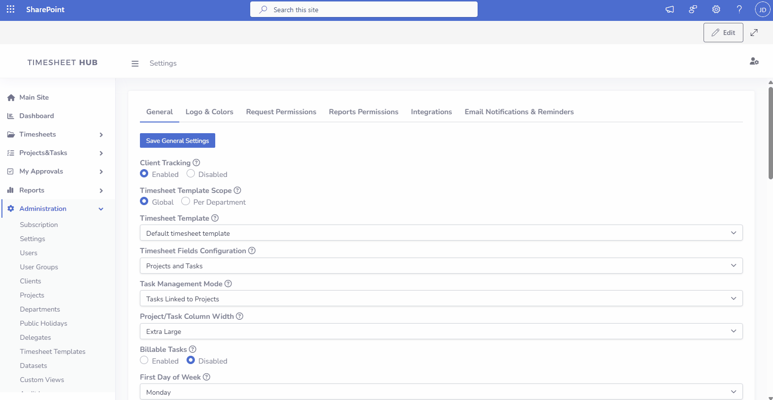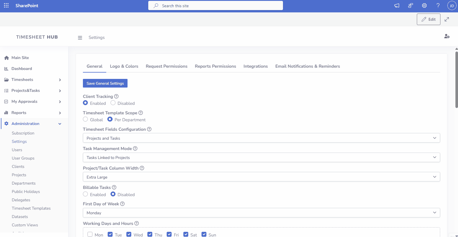 - Configure General Settings, Timesheet Constraints, Workflow etc