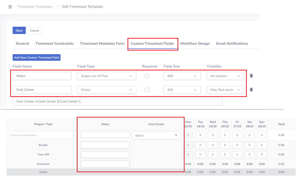 If there is a business need, the app administrator can define Custom Timesheet Fields that will be displayed on the timesheet form (for example, Notes, Cost Center, etc.).