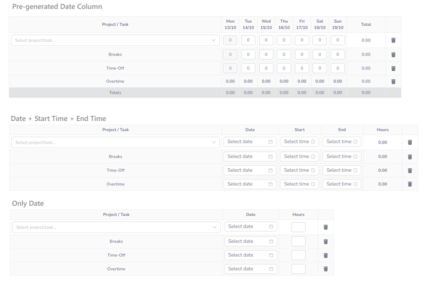 - Only Date: Users select only the date of the task or workday, without specifying start or end times. This mode is typically used when tracking daily activities or presence without time details.