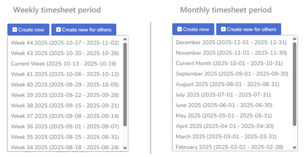 When creating a new timesheet, users select the reporting period from a drop-down list showing the most recent periods available. The format of this list depends on the selected period type. For example:
