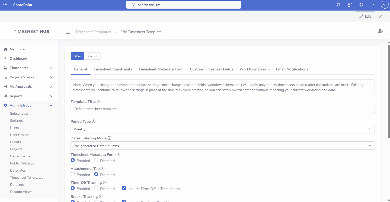 Note: Changes affect new timesheets created after saving. Existing, in-progress timesheets keep their original settings.