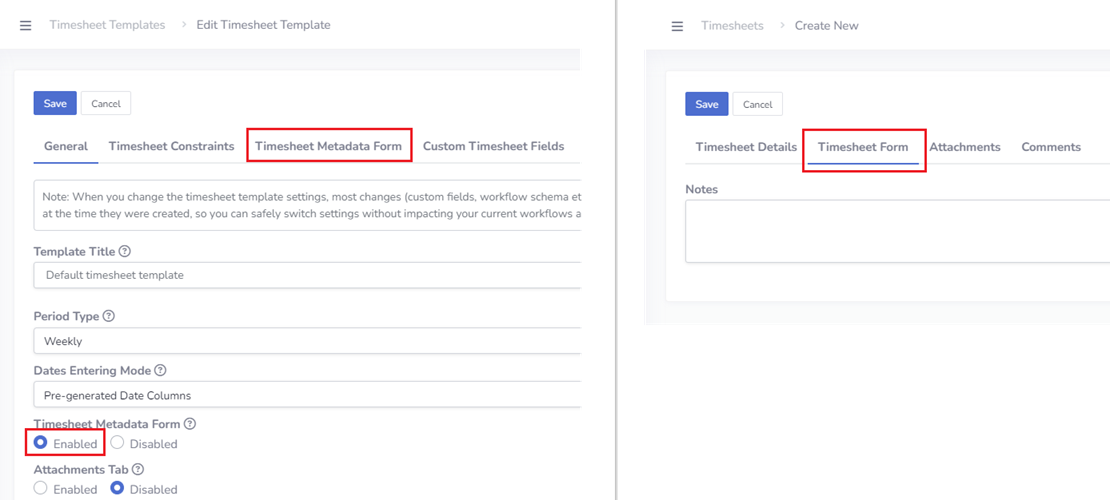 | Timesheet Metadata Form | When enabled, an additional tab Timesheet Form will appear on the timesheet create/edit page. You can design the form schema in the timesheet template settings under the tab Timesheet Metadata Form. |