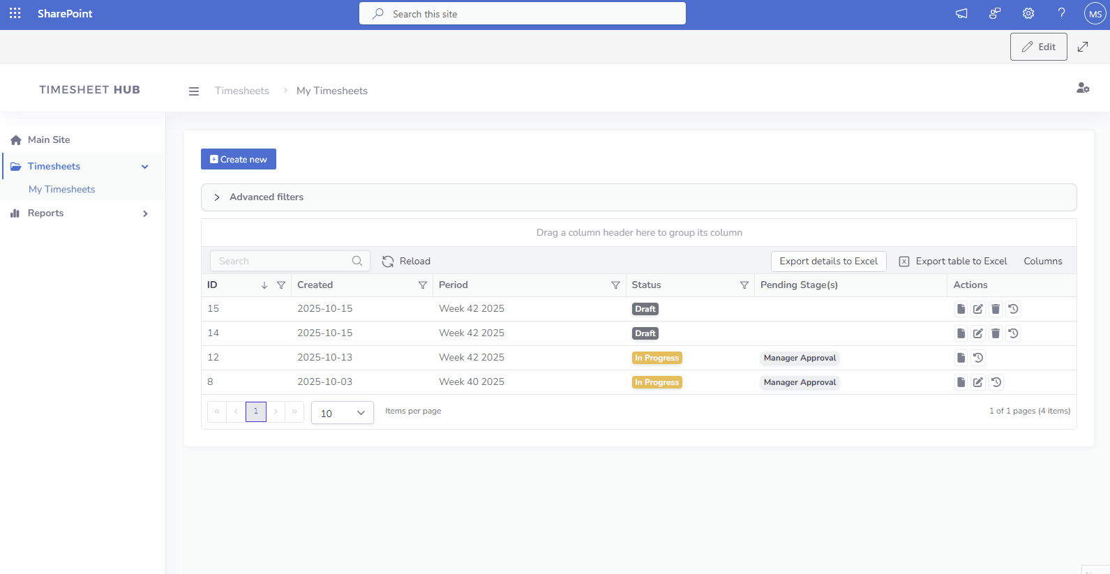 - Timesheet Info: Displays key metadata about the timesheet, such as its status, period, and other related details.